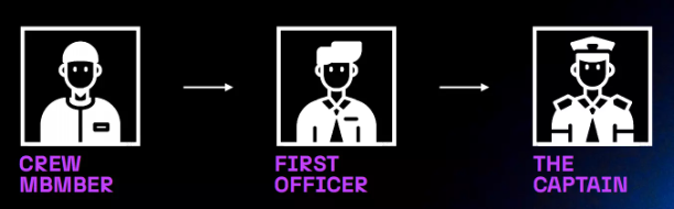 To become a captain you must work your way up. Start as a crew member. Once you have earned enough contribution value, you can prove yourself to each captain or buy a first officer promotion certificate from the market to become a first officer and get a first officer NFT. first officers will become captains when they have accumulated a certain contribution value and thus get the captain's unique rights and benefits.
